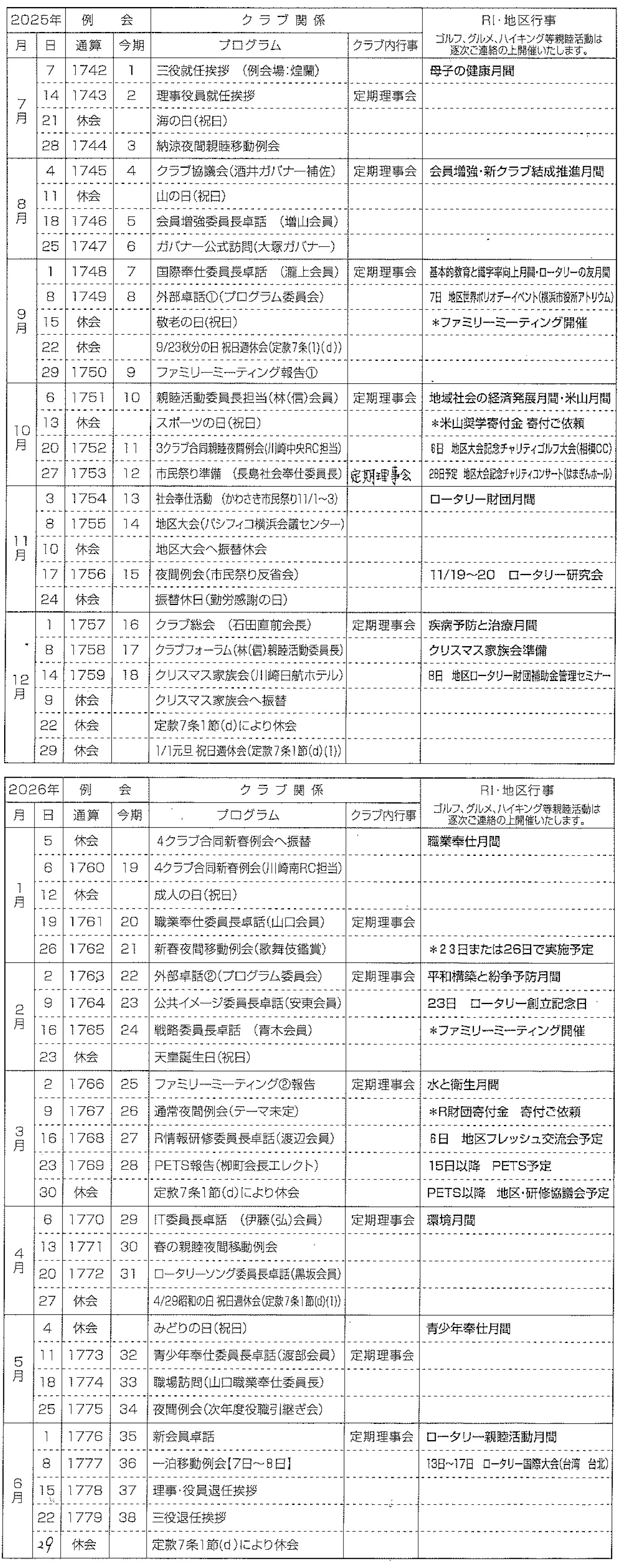 2025-26年度 川崎中央RC年間行事予定表