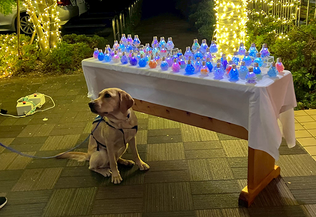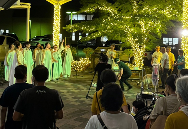 病棟のお子さんたちの手作りによる、火を使わないカクテルランタンを並べ、点灯式を行いました。
